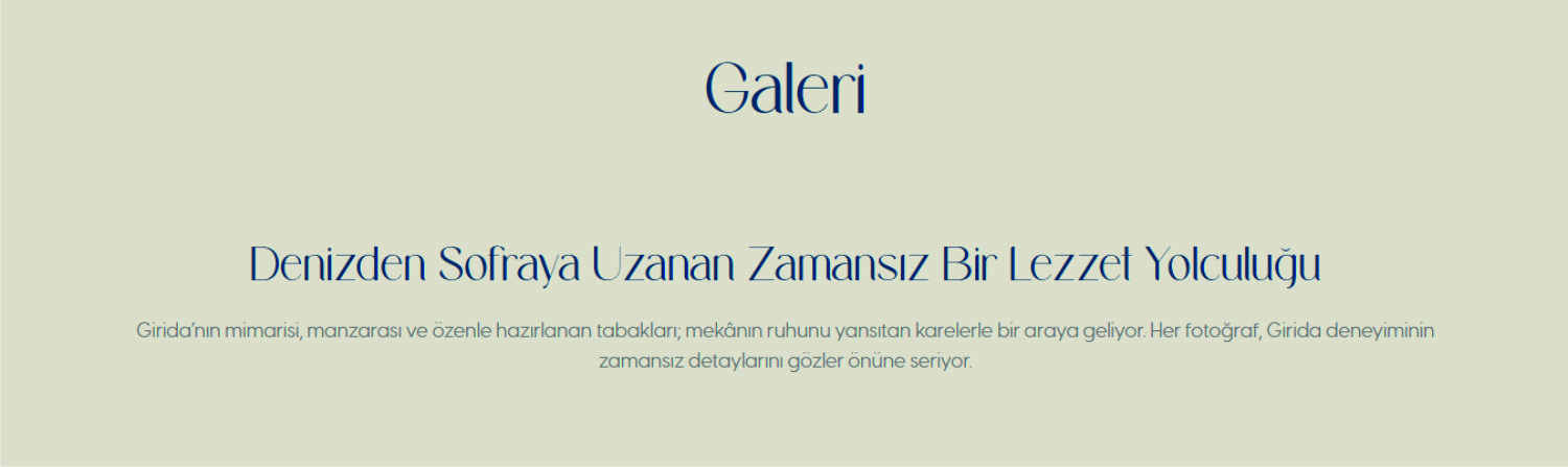 Girida’nın mimarisi, manzarası ve özenle hazırlanan tabakları; mekânın ruhunu yansıtan karelerle bir araya geliyor. Her fotoğraf, Girida deneyiminin zamansız detaylarını gözler önüne seriyor.
